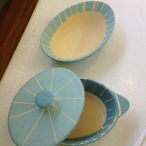 Rd through Hout Bay. It is a hotspot for kids parties, so if you are kid averse then phone first and ask. There were no parties today so it was relatively quiet. There were all sorts of items to choose from- plates, cups, statues, ashtrays, dishes, teapots and vases. I chose a pâté dish and a bowl. I thought they would be nice when entertaining to be able to put olives, side dishes, all manner of things in both. I used the colors I want for my new kitchen. I chose teal, turquoise and sunflower yellow. The colors of sunshine and happiness and the sea.