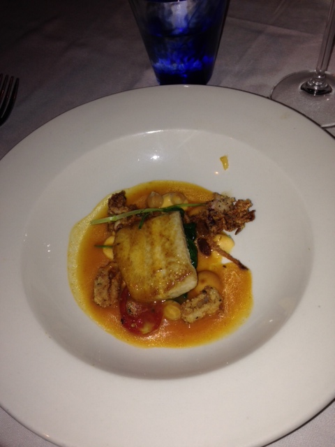 Pan-fried line fish Chick pea puree, red pepper emulsion, raisins, calamari, baby spinach and smoked paprika.