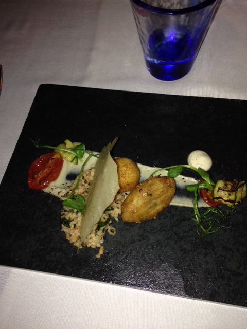 Mezze Goats cheese croquette, falafel, tabbouleh, smoked aubergine puree, grilled baby marrow and sumac.