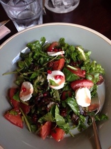 We tried a few different starters in order to taste a few options. We had the calamari in a crunchy potato basket and a beautiful salad with tomato, cheese, pomegranate and a balsamic glaze.