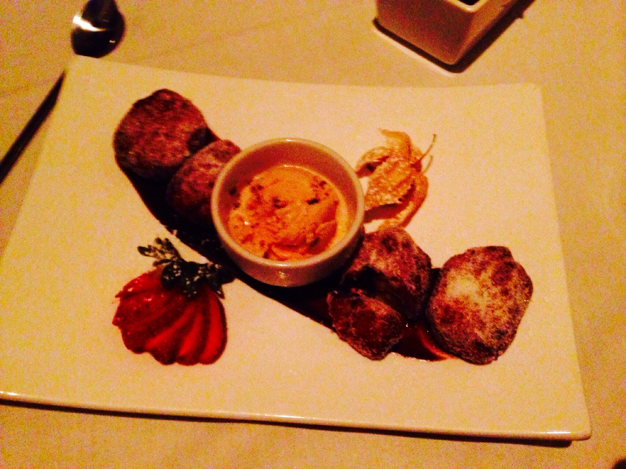 For dessert we chose to share the Banana and Chocolate beignet: chocolate centered banana donuts with cappuccino ice cream. These should have been more donut less banana as they were slightly stodgy. A beignet cooked properly is light. We couldn’t finish them.