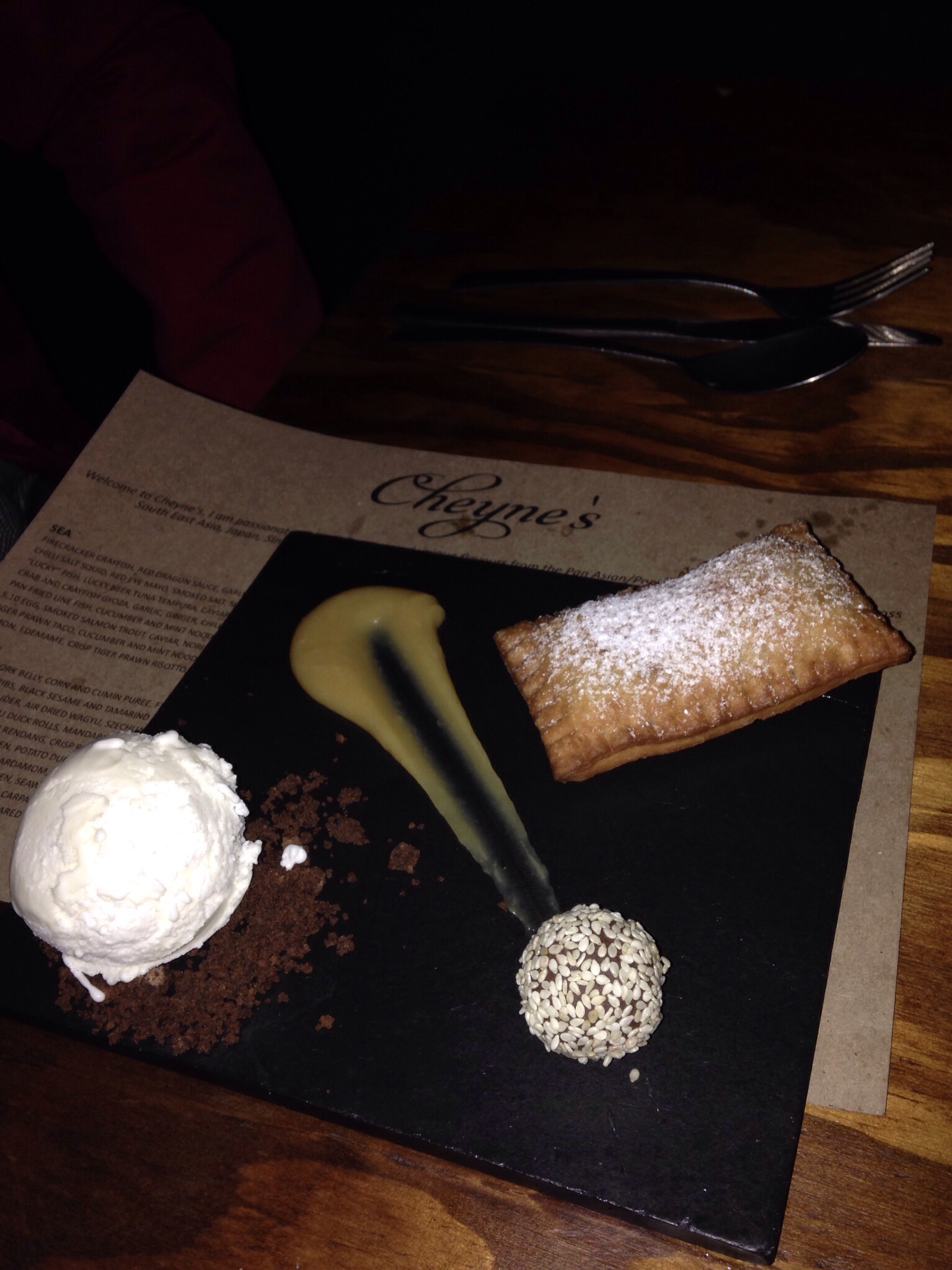 We had ordered 3 portions of our favourite potato and coconut dumplings with hot and sour coconut cream but Cheyne gave us a few complimentary ones. They seemed a bit doughy last night, they are normally really light and fluffy. They seemed just slightly undercooked. 3 seconds difference. Fragile little bites of heaven, I’ve gone on about these before!