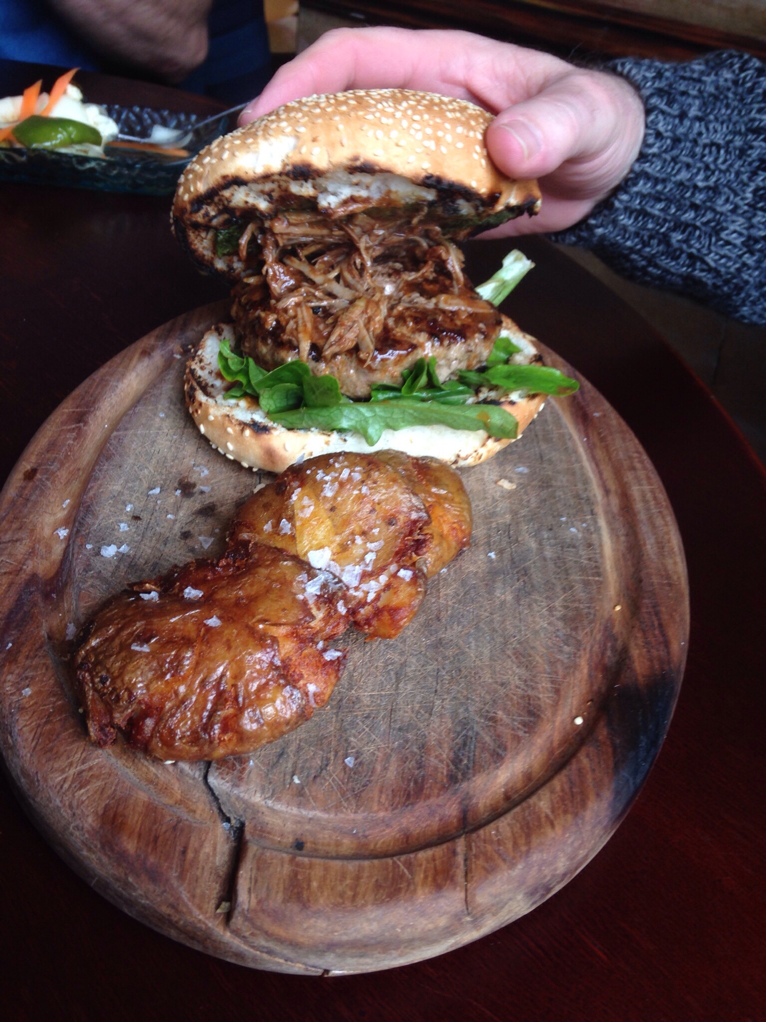 For my main I had the cheddar, bacon, pickle and jalapeño burger and Norm the pulled pork chorizo burger,