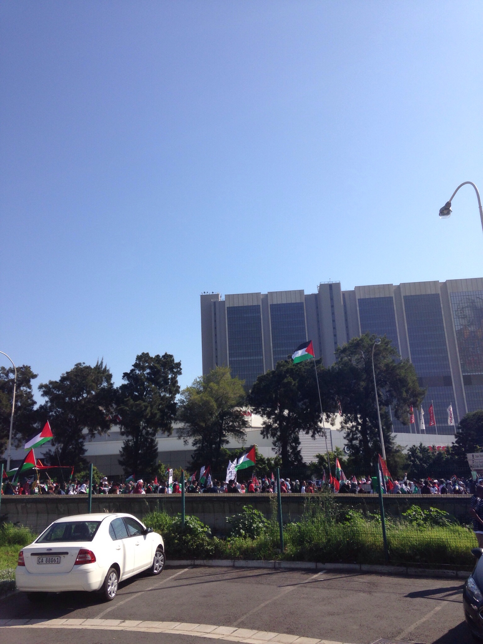 We stopped at Jason’s Bakery for a takeaway chocolate croissant for our breakfast and went to the Nissan dealer to check out the Juke. They have one in the range I want but it’s a manual. I want an automatic. I’ve always had a manual, but going up and down mountains is doing my head in. I wanna cruise and not shift! They put my lovely lil Peugeot onto the racks to check her out, and took down the info on what I want. They will email me the details of the deal they are willing to make. We then ended up surrounded by protesters on a march. Apparently there were about 3k people there, it was quite intimidating but the vibe was non-violent, just intense. It was the march in support of Palestine, ‘United For Gaza’.