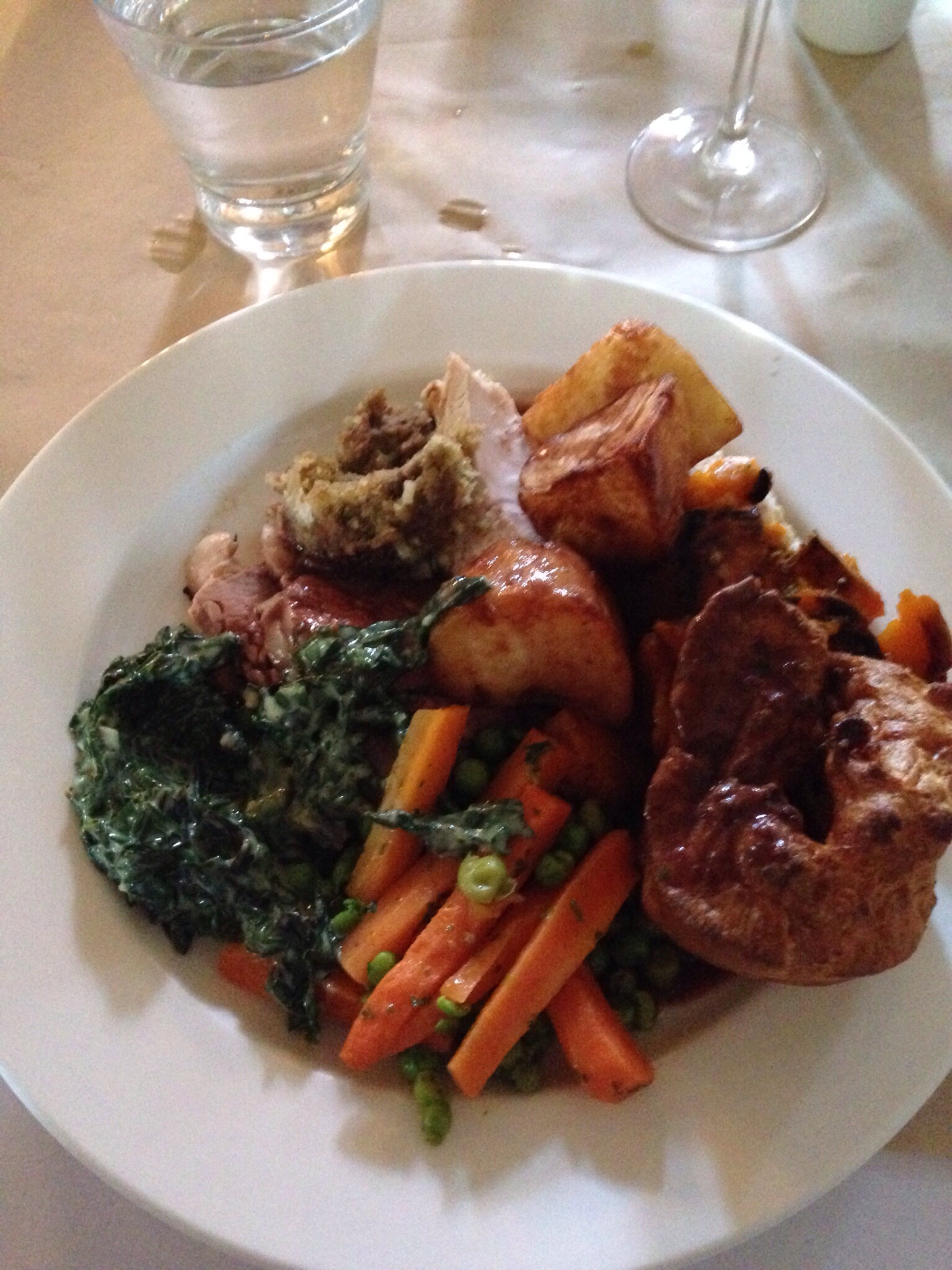 For main it’s all set out on a table and you go up and serve yourself or they serve some things. There is a roast of the day, today was a tender, perfectly cooked beef roast and roast chicken complete with a nice sagey stuffing. As sides there is big fluffy Yorkshire puddings, roast potatoes, roast sweet potato, creamed spinach, peas and carrots and a delicious rich gravy to top it off. The menu said cauliflower cheese but there was none when we went up. It was all perfectly cooked, the portions ok, I would have liked a bit more meat however. The other issue was that it was a bit tepid in temperature by the time you shuffle along the queue and get seated. Personally I would have people stay seated and let them choose the starter and dessert and just serve people consistent plates of food at their table. More like the Sunday roast at Treetops at Silvermist I liked that set up.