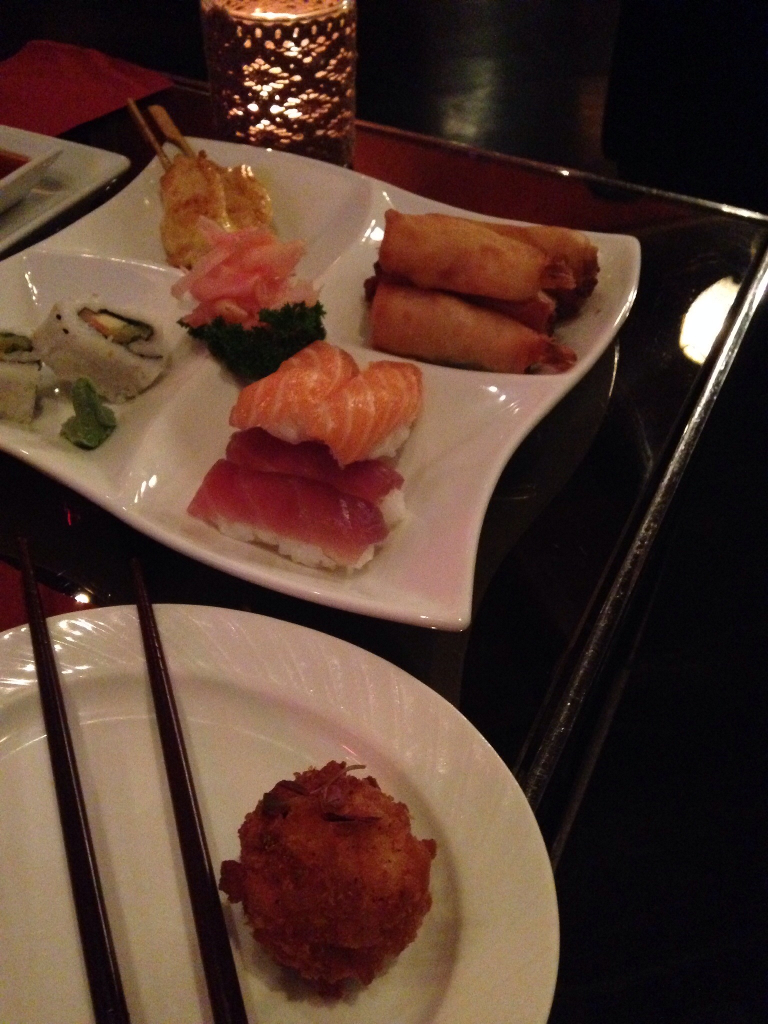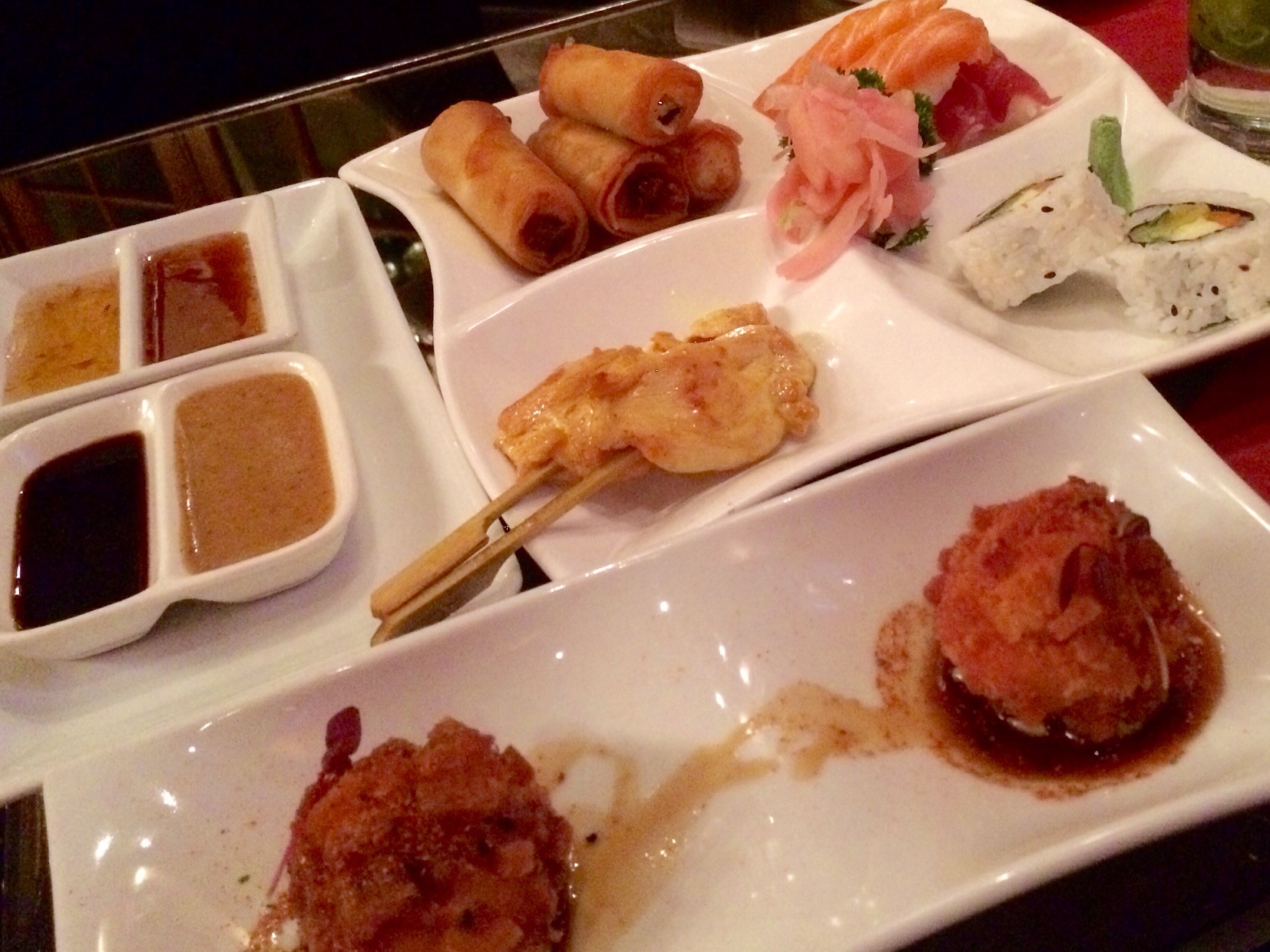 The chicken satay was tender, the sushi fresh and firm, the spring rolls crisp. I love that you get a variety of sauces. The prawn balls were on a bed of wasabi mousse and sweet chili sauce. They were little balls of heaven. Really divine and my fave of the items ordered.