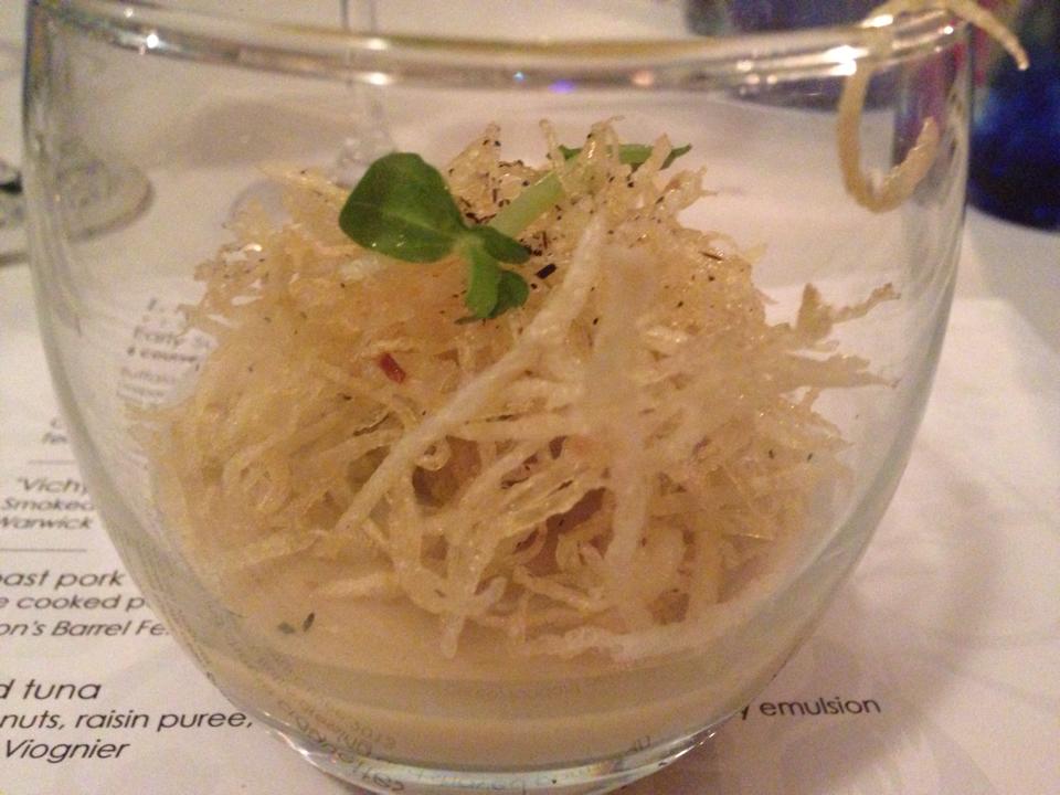 The next course was a modern ‘Vichyssoise’ Smoked leeks, leek ash, crispy potatoes, leek and potato panacotta. The thick bottom was so delicious and beautifully flavoured and the crispy potato topping was perfect.