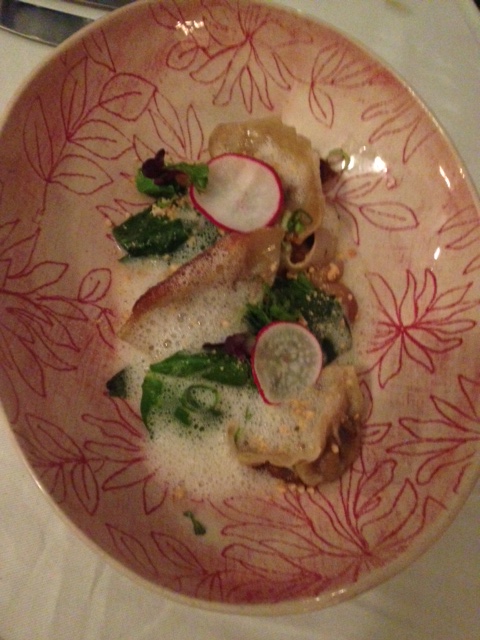 Mick and Jasmine had the Mushroom Pot Sticker which was satay, charred endive, picked mushrooms and white bean puree.
