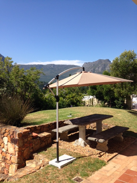 We can now dine out front where we have such a lovely view of the back of Table Mountain. We do have an entertainment area at the back but there is no view there so we tend to use it at night. It is nice to have a place to lunch when we are swimming as this is right by the pool.