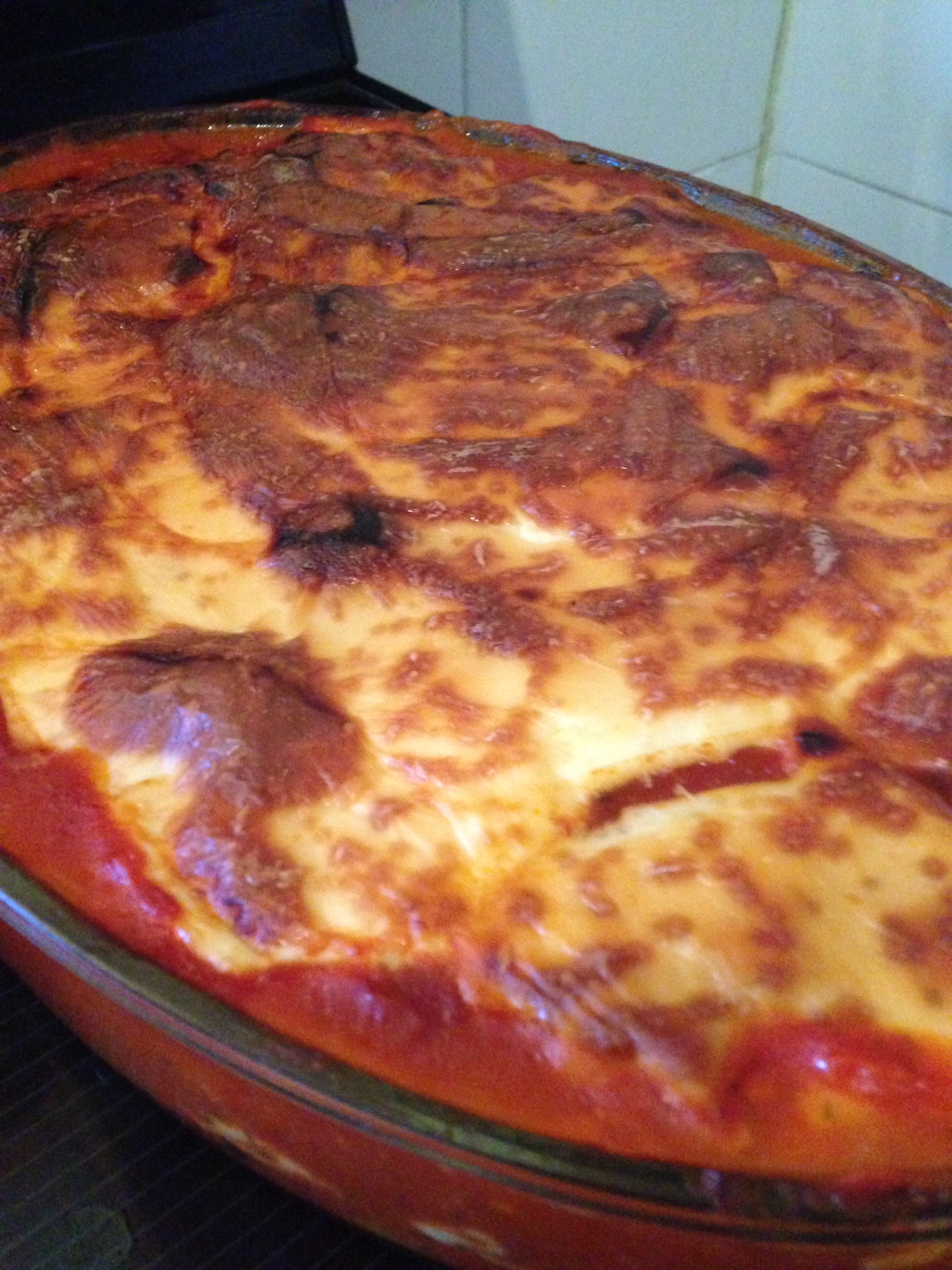 The following night I made eggplant/Aubergine Parmigiana and for my sauce I added in a huge bunch of parsley as it was in the box and I don’t like it but as I was whizzing up the onions and peppers and tomatoes in the blender I thought it was a perfect time to use some of it up. It made such a difference to the sauce. Was really gorgeous. However we thought the aubergine tasted a bit underdone as we hadn’t done the breaded option as we are trying to eat healthier so there was no precooking and the cheese was getting overdone so we took it out. But it looked perfect 😀