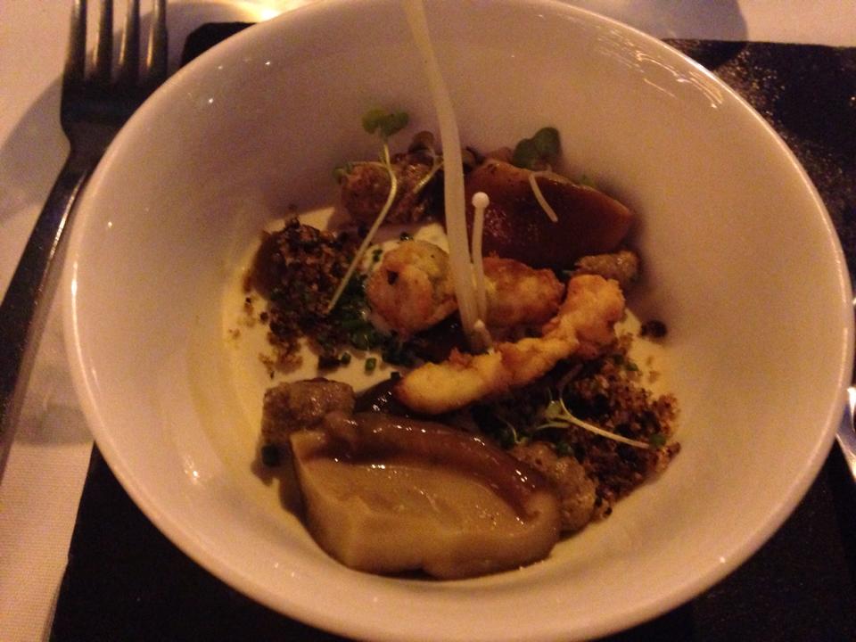 Caitlin had the Mushroom Pot Sticker served with Satay, charred endive, pickled mushrooms and white bean puree. She thought the filling of the pot stickers to be a bit too intense to serve as a separate item, she thought it might be better as a side dish with something less intense. I didn’t taste this so I only have her feedback to go on. However I am not a huge fan of foam and I had seen this dish before so it did not appeal to me.