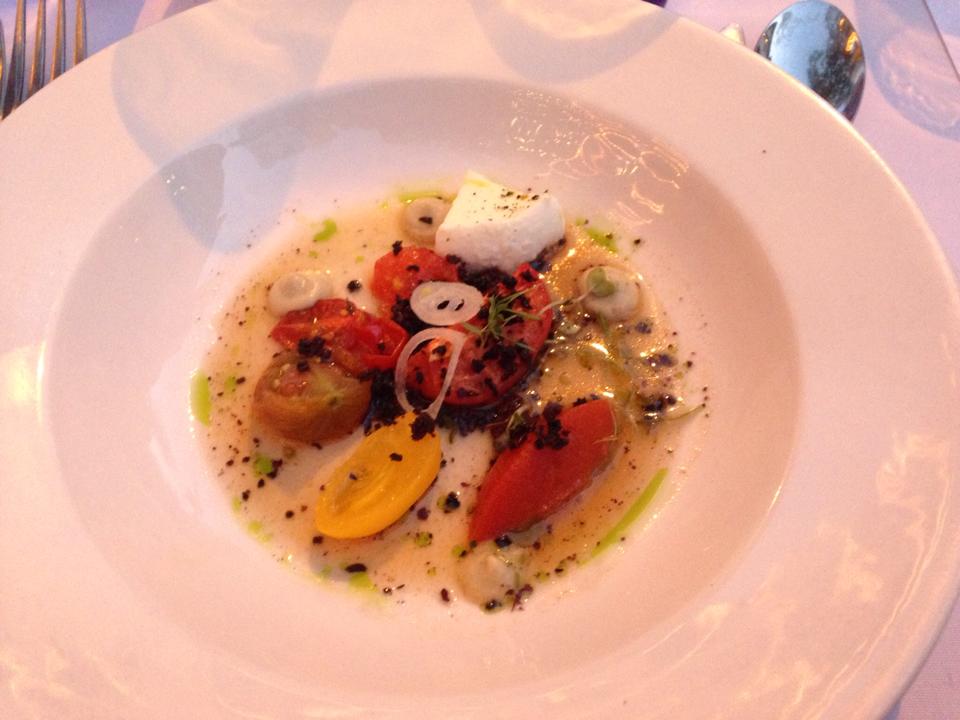 Tomato salad which consisted of Basil oil, olive powder, smoked aubergine, buffalo mozzarella and tomato essence.