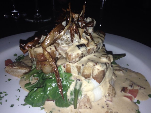 It was not too fatty which is one reason I’m hesitant to order it usually, but I love pork. I wasn’t disappointed! It came piled on a huge plate of beautiful, creamy garlic mash with wilted spinach, green beans and shallots and some perfectly cooked bits of crackling. Wow. It was just divine! The crackling was crispy yet not tough, the meat moist but not too fatty, the mash plentiful and they were generous with the sauce. I would recommend this to any pork lover.