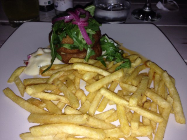 Norm had a burger with Camembert, bacon and cranberries, Trevor had lamb kofka, Amber had the Moroccan chicken, Caitlin had a Moroccan prawn salad, Annie had the hake and chips and I had Thai fish cakes.