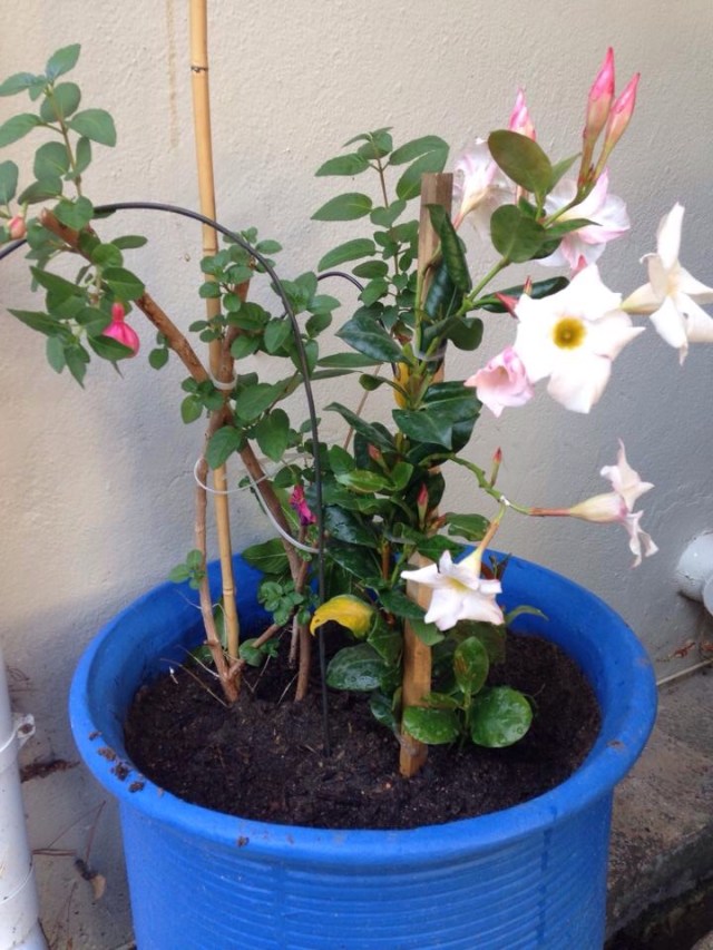 We put the vine by the patio at back and we hope it climbs up the rail or the drain.