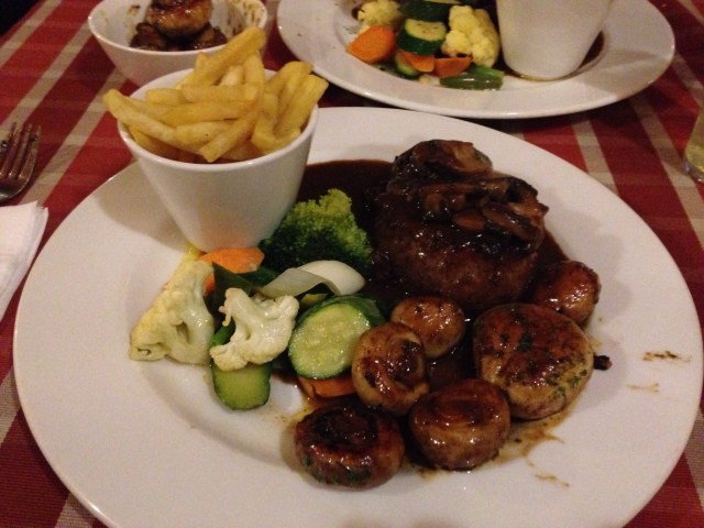 We had the usual fave Hollandse Biefstuk which is Pan-fried beef fillet with mushrooms flambéed with brandy. It’s R160 and comes with gorgeous al dente fresh veg. We had chips with ours. As always it was divine.