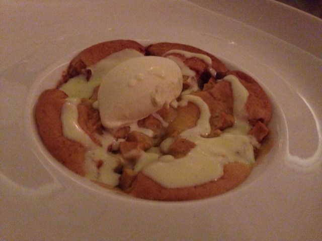 The dessert was warm apple cobbler with orange blossom ice cream and english custard cream.