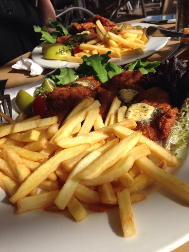 But the fact that they allow people to smoke outside despite the law meant we had to move tables. We both ordered the chicken schnitzel with chips.