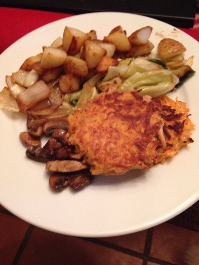 Fried potatoes and garlic, fried onions and sautéed cabbage, fried mushrooms, and fritters made of carrot and kohlrabi. It was delicious.