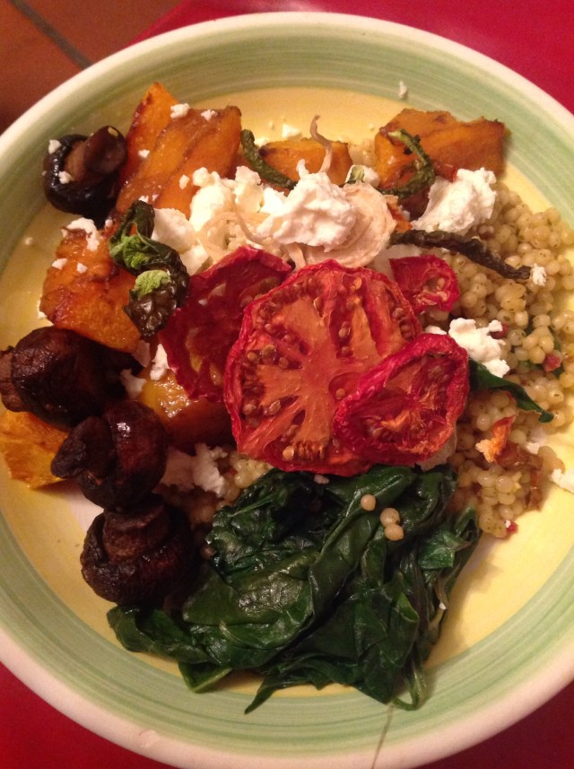She made a flavoured couscous, roasted organic locally grown butternut and porcini mushrooms, stir fried spinach with lots of garlic and topped with crumbled feta and sun dried vegetables. The couscous was much larger than the finer version we normally buy, it was like risotto and normal couscous had a baby. It had the creamier consistency of risotto somewhat. The sweetness of the roast butternut and the bitterness of the spinach were a perfect balance. It was like a winter version of a salad.