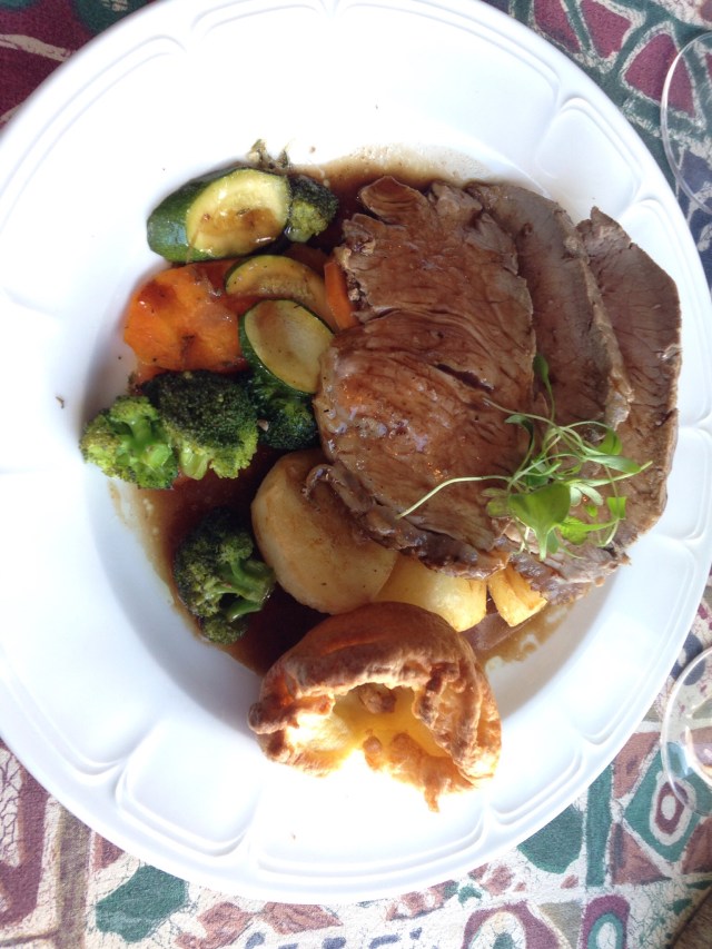 It was a sirloin roast, nicely tender. It was served with roast potatoes, al dente veg of carrots, zucchini and broccoli. There was a Yorkshire pudding as well. There were 3 large slabs of beef.