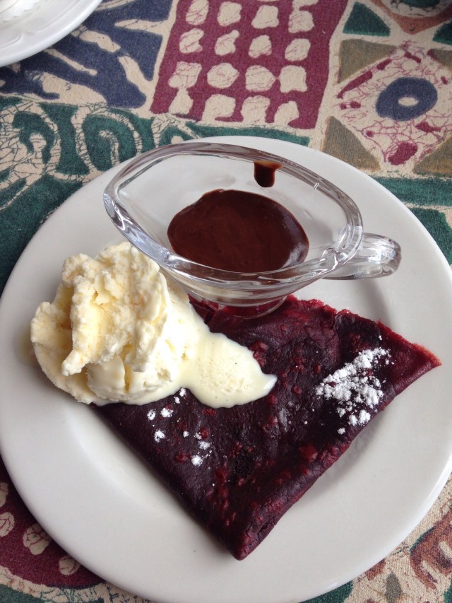 She dashed off and brought back a nicely warmed pancake, new scoop of ice cream and a little pot of chocolate. How sweet is this?