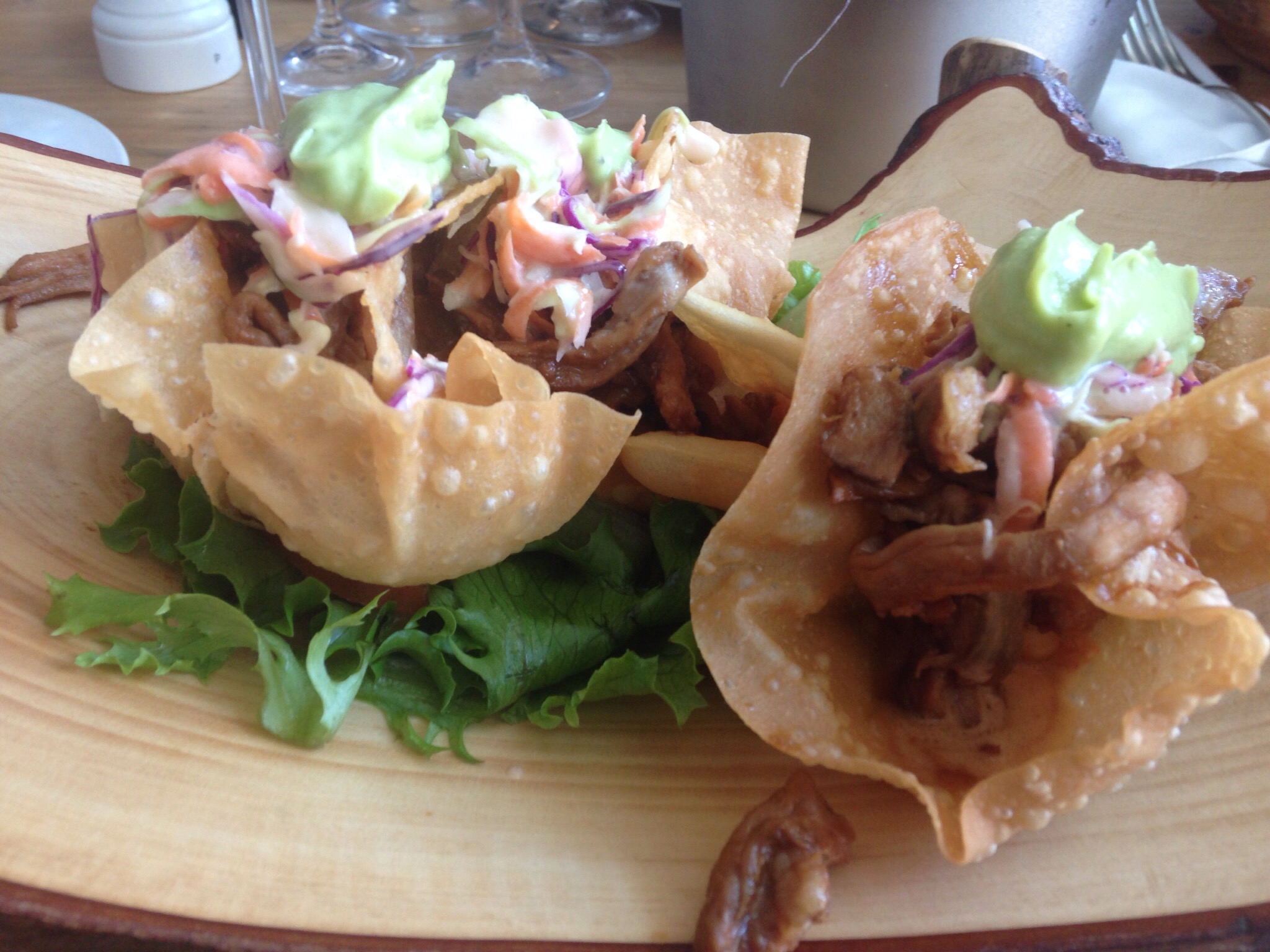 The pork tacos were nicely presented in a big wooden bowl thing.