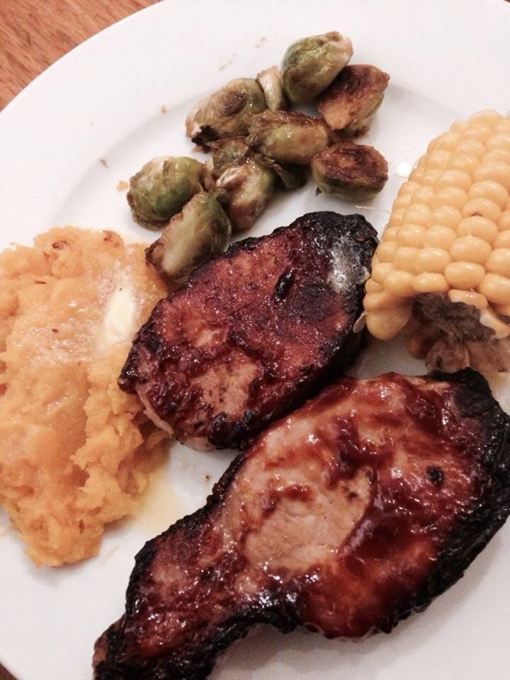 Tonight I made barbecue pork chops, gem squash, Brussels sprouts and a bit of corn.