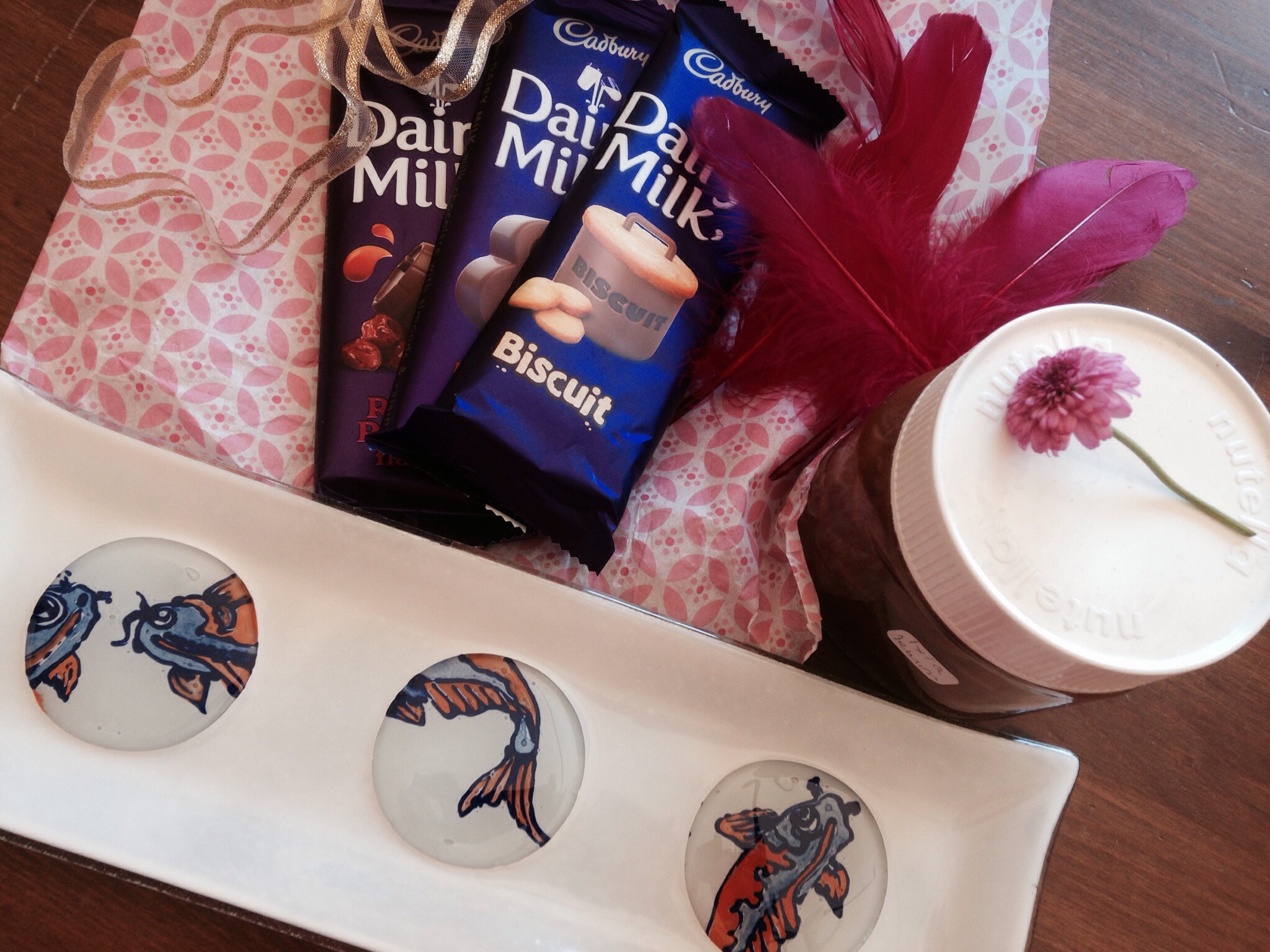 We had a lovely morning and Dawn gave me chocs and Louise a gorgeous koi decorated platter and home made lemon marmalade made by her Mum from Louise’s own trees.