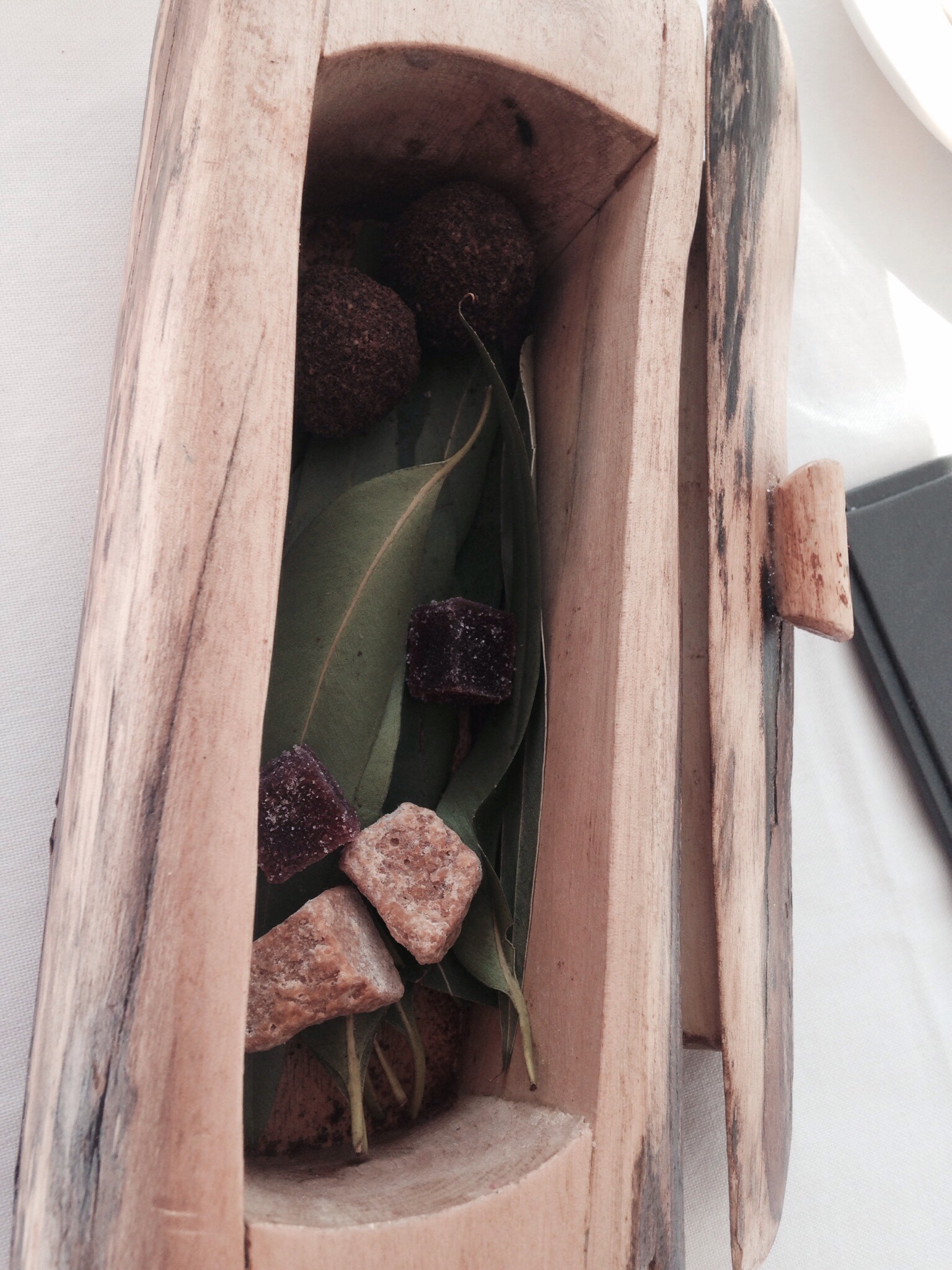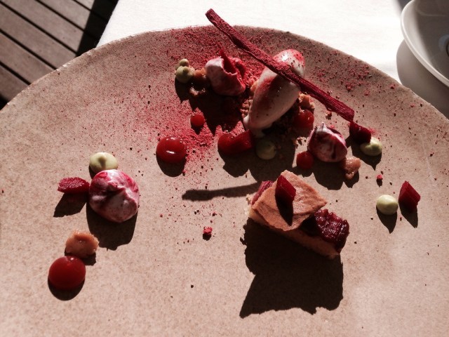 We had a coffee and then the dessert arrived. RHUBARB, STRAWBERRY AND ELDERBERRY: Rhubarb financier, strawberry purée, elderberry ice cream and pea pudding. No idea what a ‘financier’ is in regards to an edible object? Okay some rude jokes about hookers come to mind, but who knows?