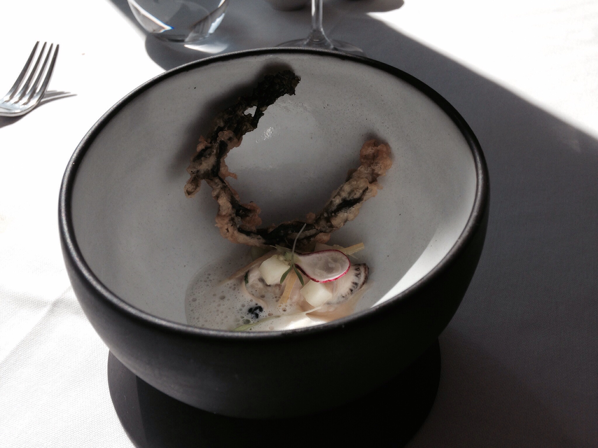 We were served the Poached oyster, lemon, caviar, seaweed and apple course. It was so delicious the seaweed light and crispy, the oyster fresh.