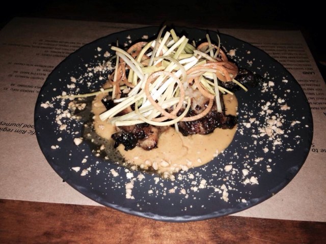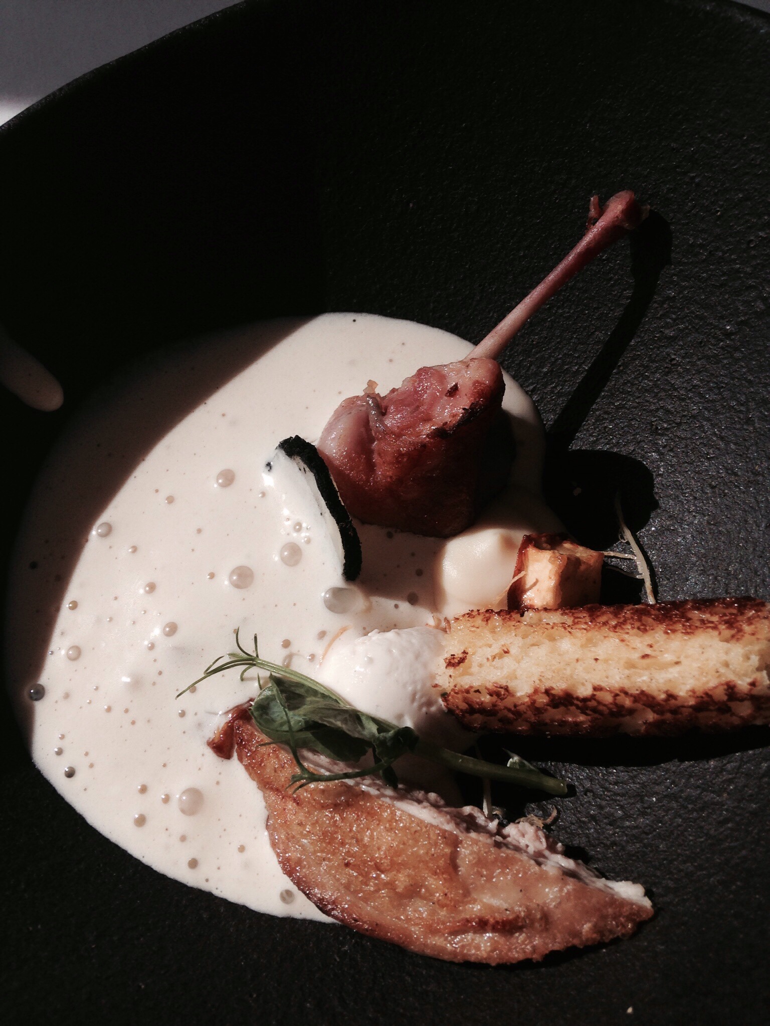 Next we had QUAIL AND CELERIAC: Pan seared quail breast, confit leg, celeriac and truffle espuma, smoked goat cheese. The quail was tender and not overwhelming with gaminess. The espuma had a gorgeous almost nutty taste.