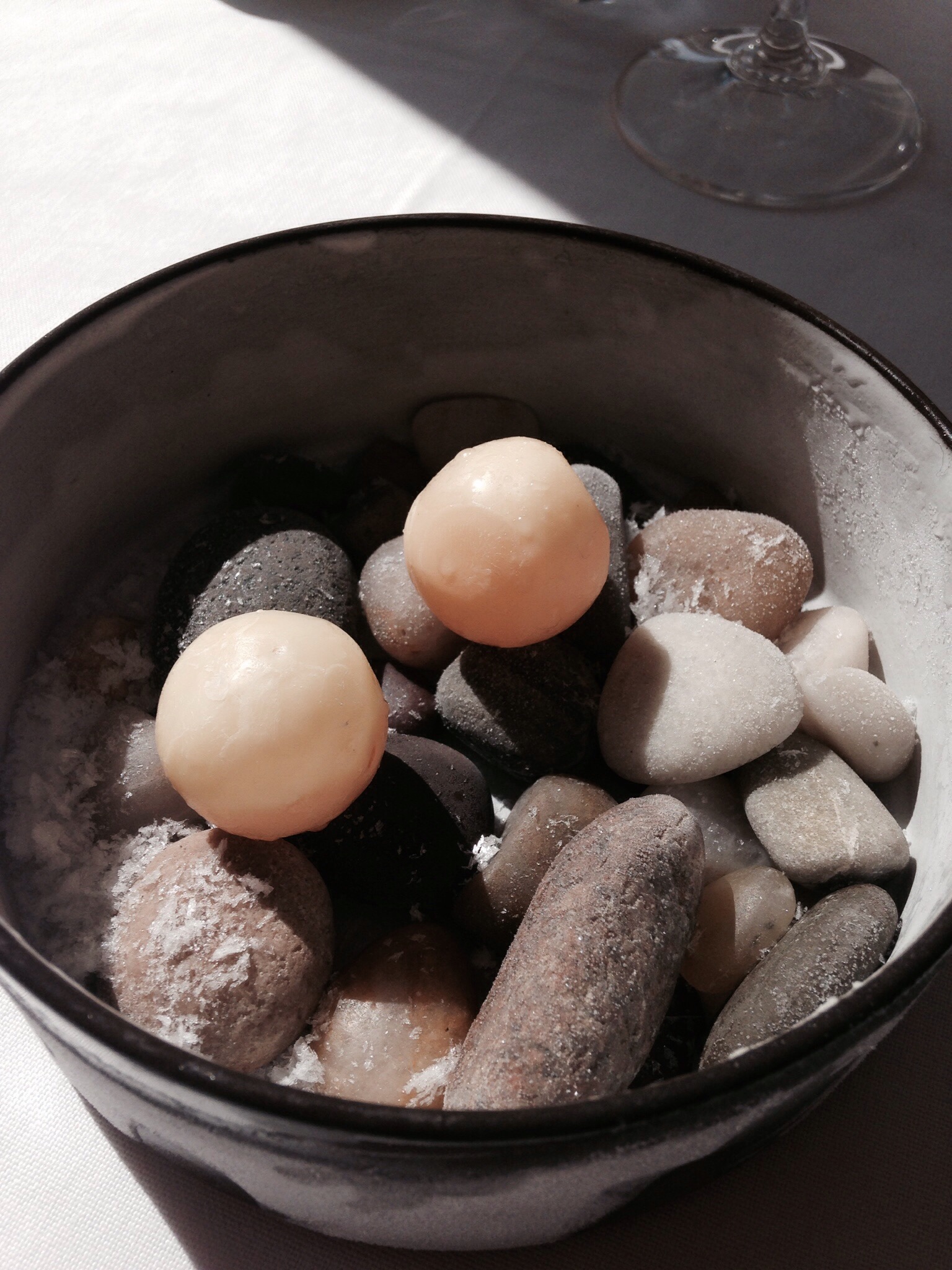 The sorbet is frozen into balls, speared with a toothpick, rolled in cocoa butter and refrozen. You pop the whole thing in your mouth and the warmth of your mouth melts the butter, filling your mouth with a delightful sweet slush. We watched another diner try to be posh and spear his delicately with a fork only to have it disappear. Oops. Get yer fingers in there!