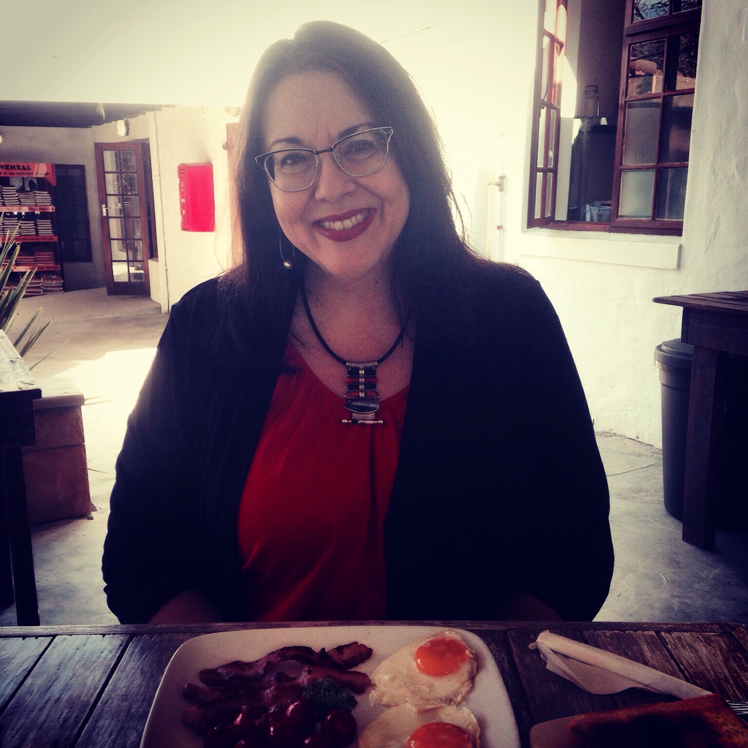 We met at the newly relocated Earthworx Garden centre in Hout Bay. It’s about 5 minutes drive from my house. I chose the fried eggs with bacon and tomatoes.