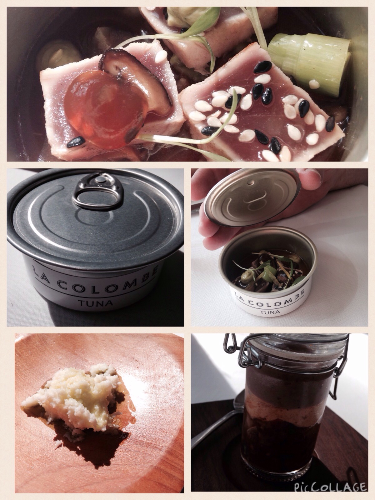 We were presented with a complimentary amuse bouche in the cutest little container. There was a big chunk of bread, a layered glass jar of hummus, tapenade and sun-dried tomato. A separate dish of ‘virgin butter’ and a divine wee tuna tin.