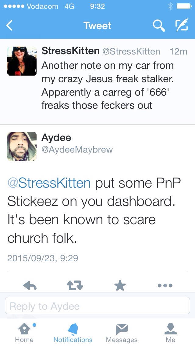 I had another letter left on my car by my crazed religious stalker. This interaction on Twitter when I had a whine about it all made me laugh.