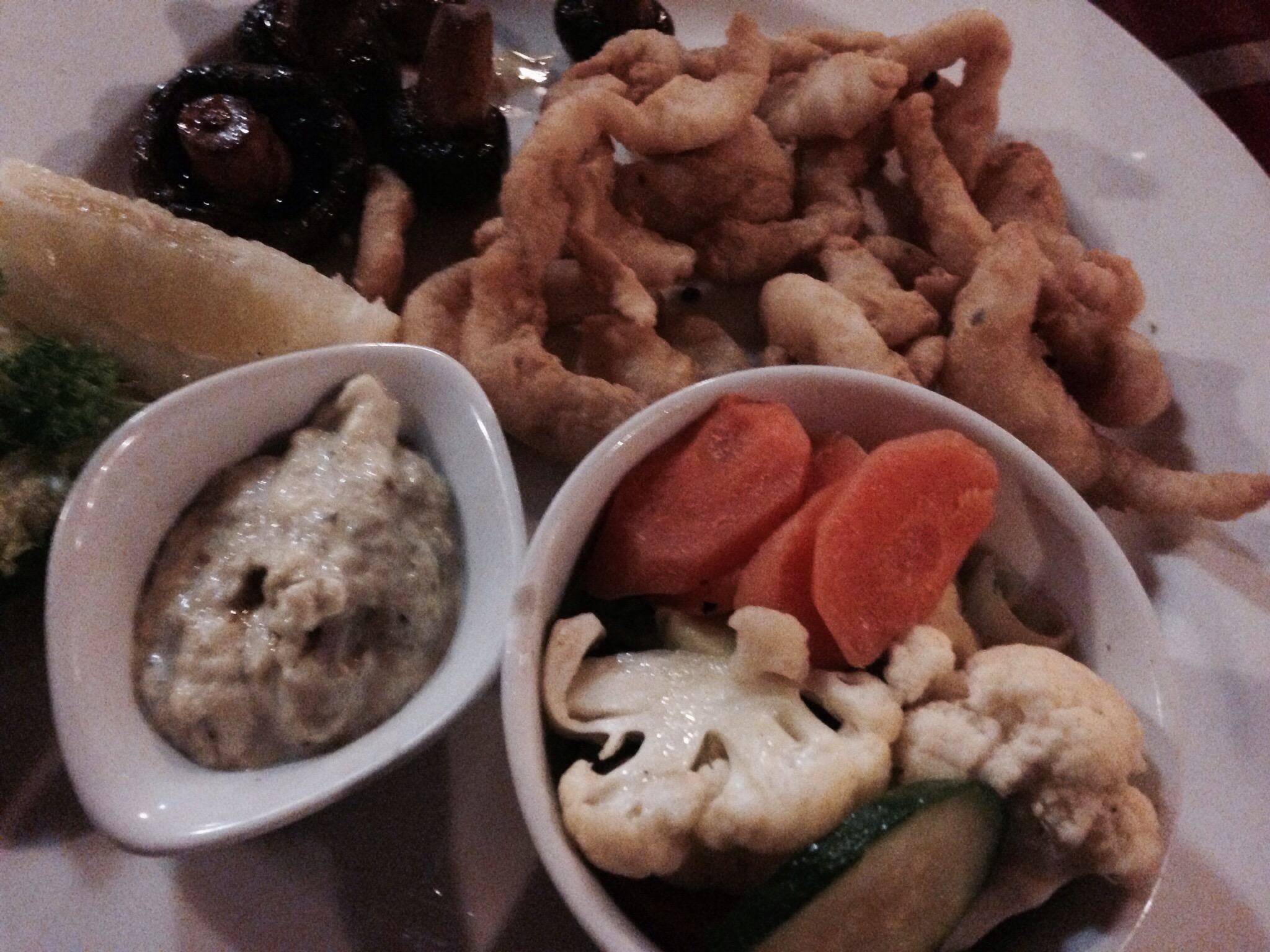 Pescatarian Cait had the calamari with salad and steamed veggies.