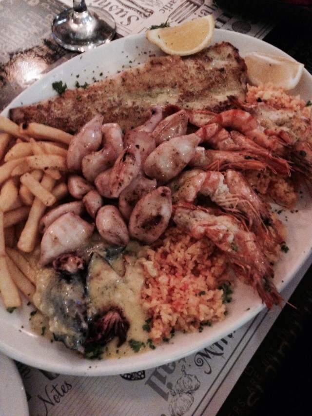 Linda had the baby platter which she loved. Hake, mussels, calamari and prawns.