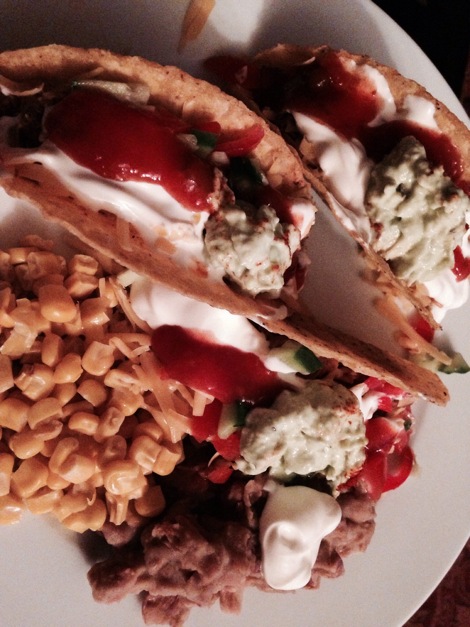 The next night I shredded the rest of the beef roast and added lots of spices, made refried beans and corn and Cait made up all the toppings. Mmmmm.