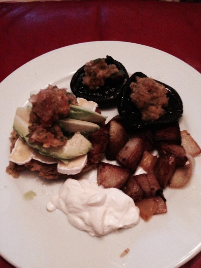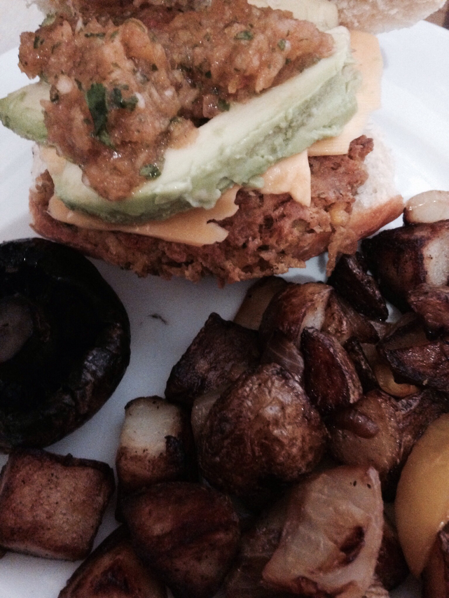 Caitlin made a tzaziki from the Greek yogurt and cucumber we picked up and I made fresh salsa from a yellow pepper, tomato, red onion and fresh cilantro. I made crispy fried potatoes, pepper and onions and we topped the burgers with slabs of fresh avocado and cheese, a creamy Camembert for Norm and the girls and a sharp pungent cheddar for me.