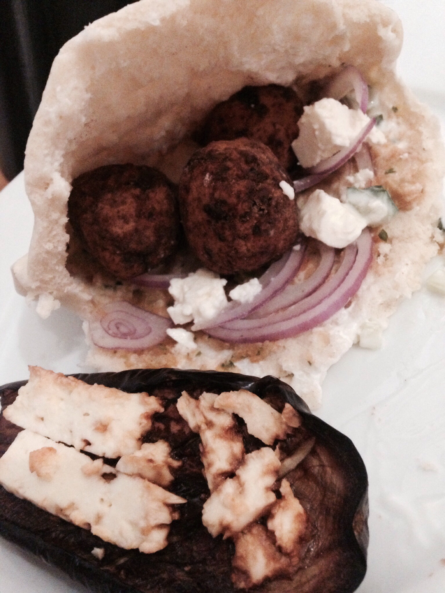 I cut the aubergines in half and baked them for a bit then topped with crumbled feta and popped them back in the oven to melt the cheese.