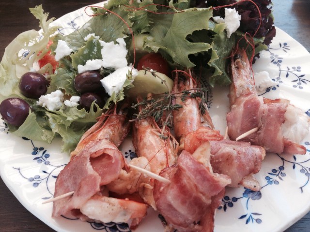 How cute are those bottles? For lunch we each had the special and we shared a portion of their homemade chips. It was fresh prawns wrapped in bacon and grilled and served with warm bread and salad.
