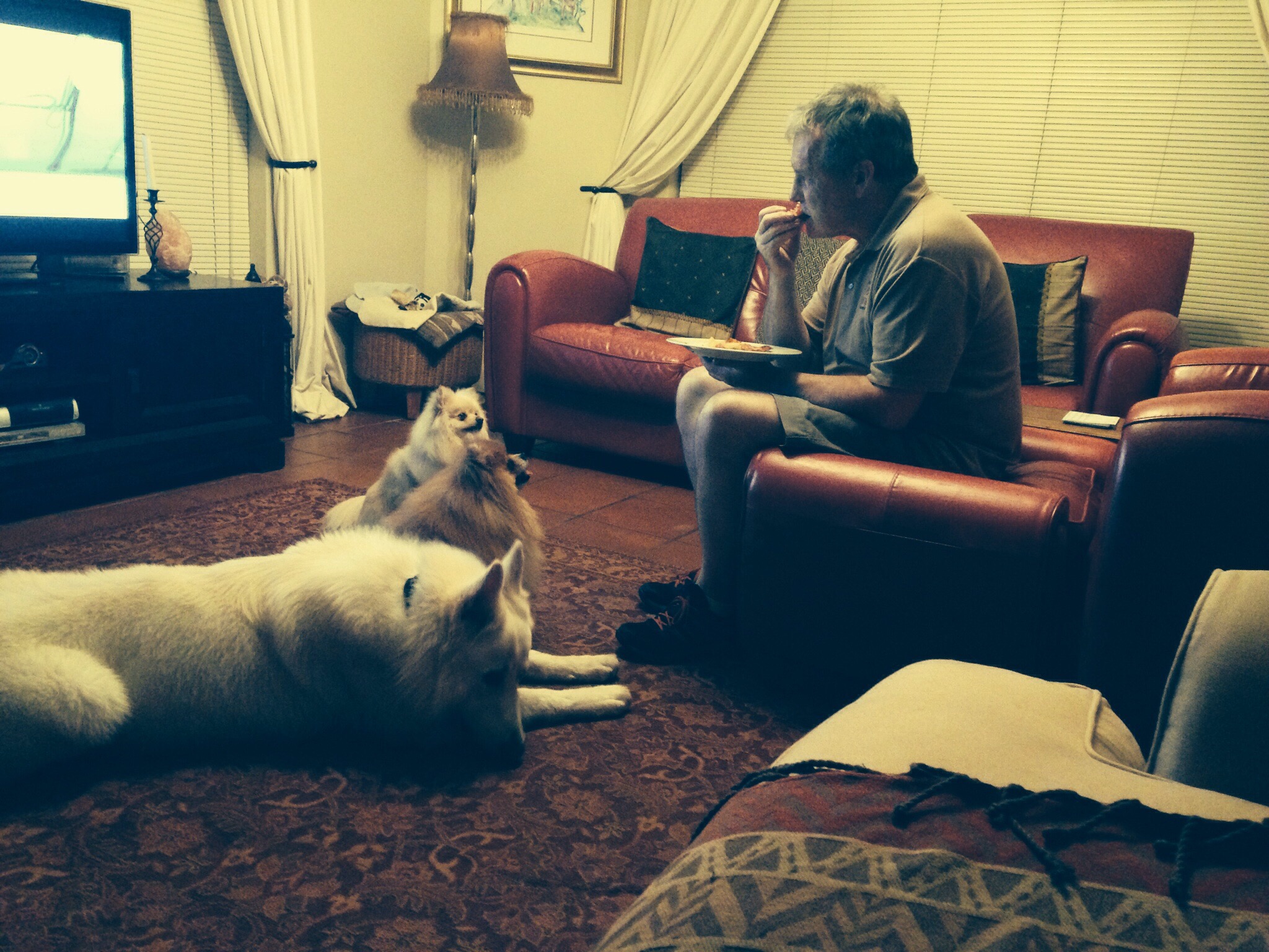 The dogs hoped a bit of crust might come their way.