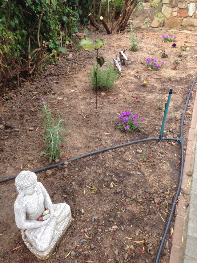 It looks nice and soon we hope the flowers will spread a bit and the empty bed fill in with some colour. This was R500 worth of flowers, a whole trolley full, but it all just disappeared in the big bed. We still have to cover it with mulch.