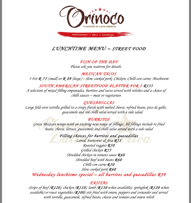 We went to Orinoco Flavours as it was a brisk 10 minute walk from our office. In typical Cape Town style the weather had turned yet again and it was boiling hot so we were parched on arrival.