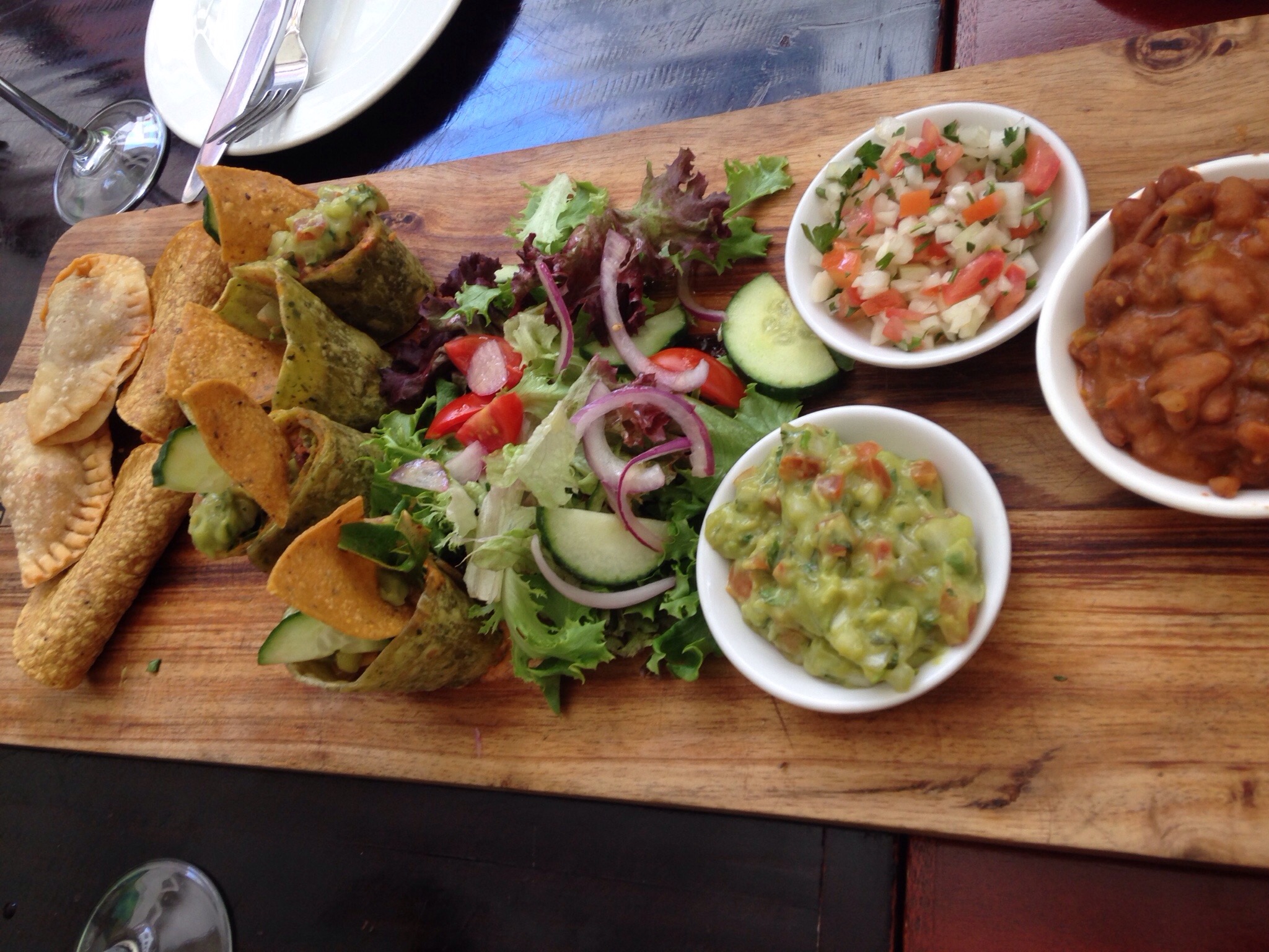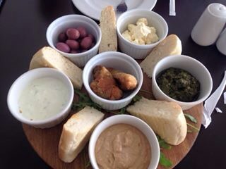 Anyway, we headed down late afternoon. We hadn’t had lunch and as there would be a free bar we popped into Tribakery for a nibble. We ordered the mezze platter.