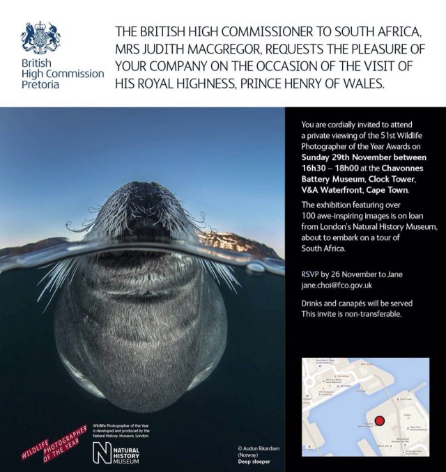 Today we were privileged to be invited to a British High Commission event at V&A Waterfront. It was the Wildlife Photographer of the Year Awards and Prince Harry was to be in attendance.