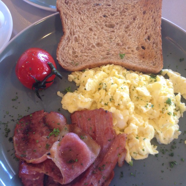 It was a round R70 inc a 10% tip for a cappuccino and 2 eggs, bacon and a roasted plump rosa tomato, a slice of toast with butter and jam. A bargain! I was fed and off quickly.
