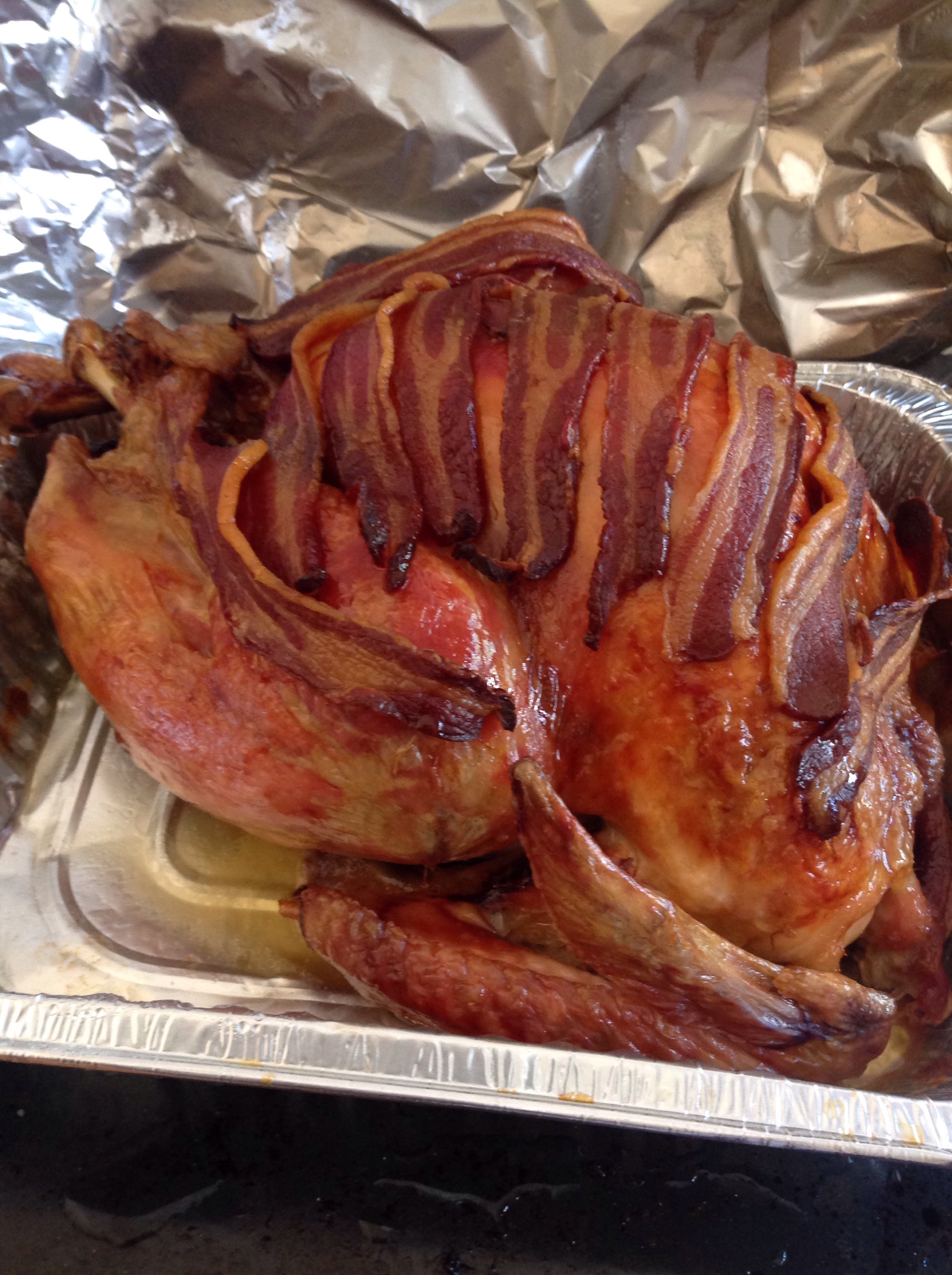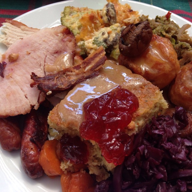 I got busy preparing for the main meal. The menu was turkey, ham, little sausages wrapped in bacon, braised red cabbage, honey glazed carrots, broccoli casserole, both roast and mashed potatoes, roasted mushrooms, brussel sprouts cooked in chicken stock and chili, cornbread dressing, homemade gravy made from turkey drippings, and cranberry sauce. For dessert we had chocolate fudge cake, pecan pie and/or magic cookie bars.