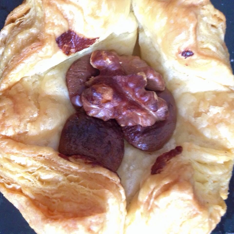 After we opened presents I decided to attempt some home made treats using puff pastry. I cut it into squares and brushed the surface with milk. I put little chocolate buttons and walnuts into the centre of the square of pastry and pulled all 4 corners into the centre and pinched them together. I baked for 15 minutes. They were delicious and so easy.